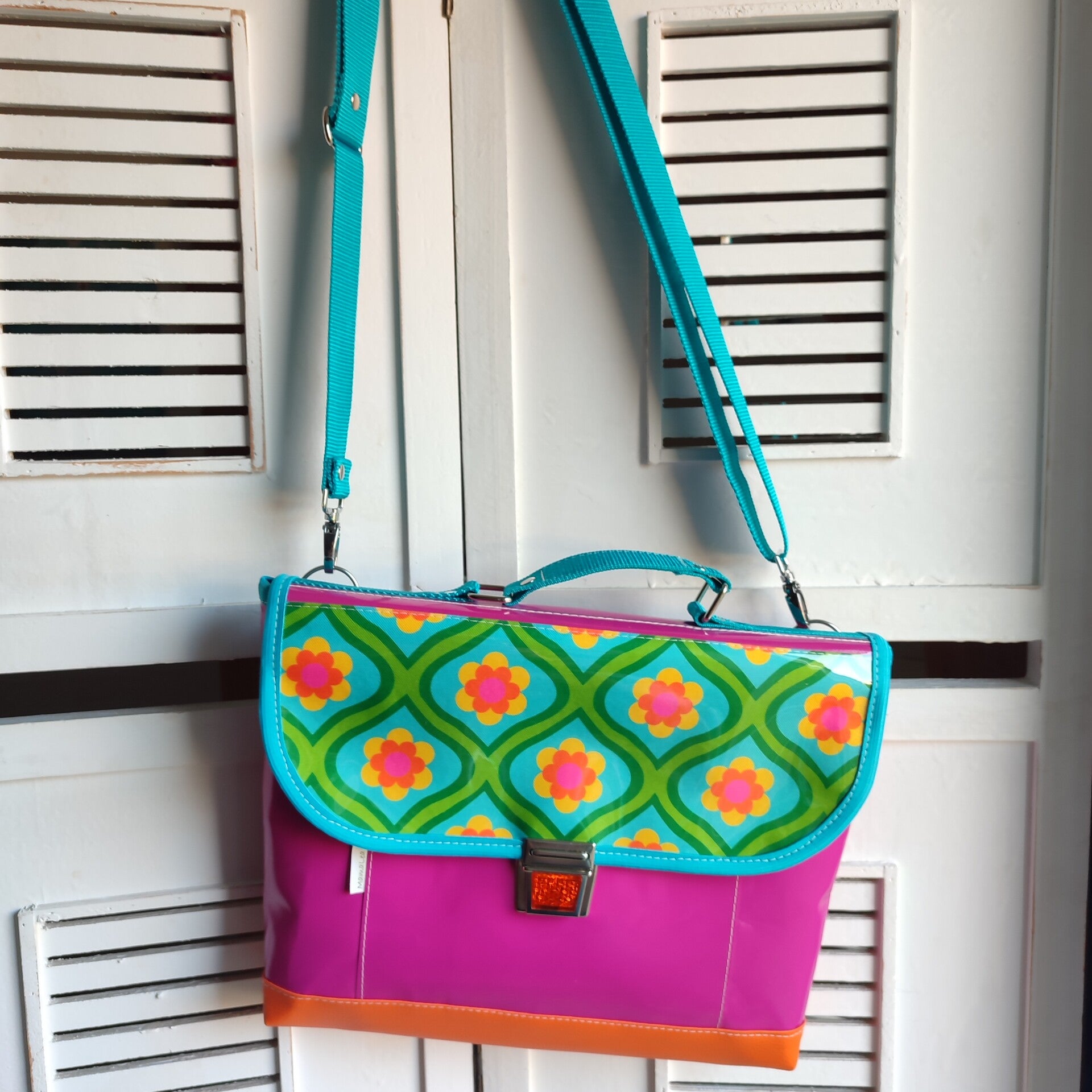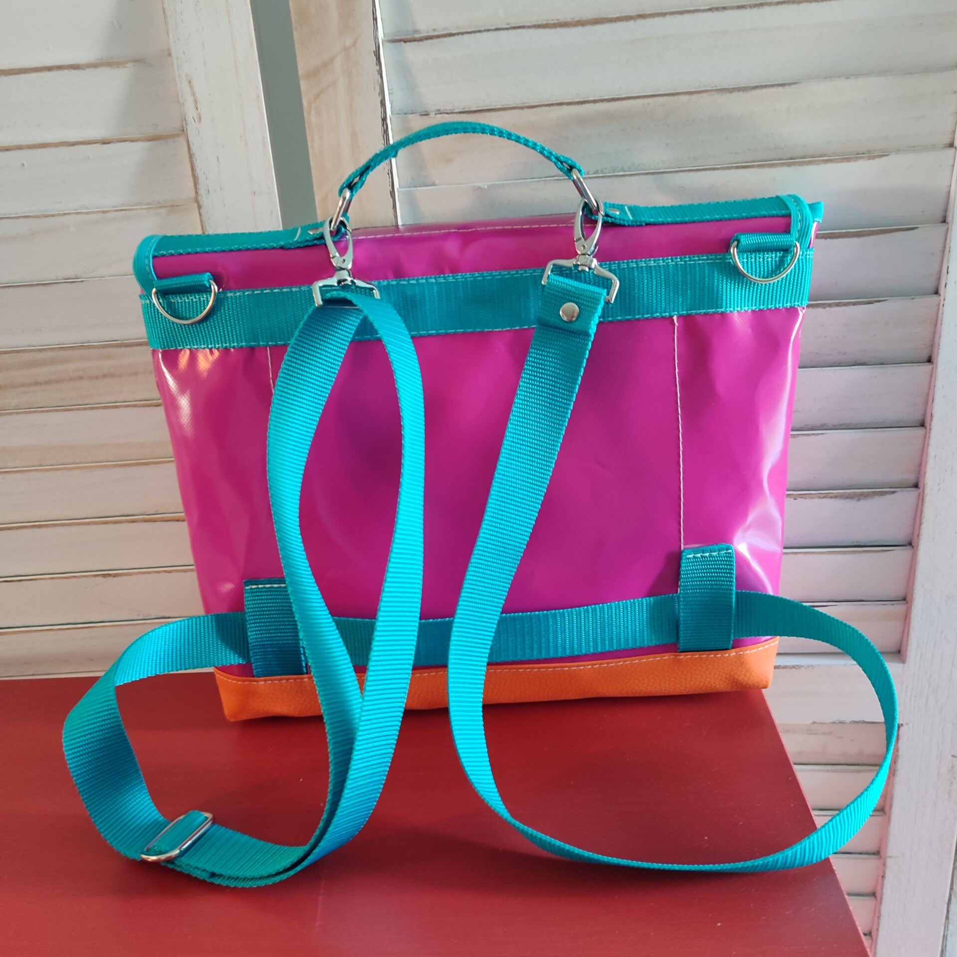 Diese Tasche aus LKW Plane kann auch als Retro-Rucksack, Schulranzen getragen werden.